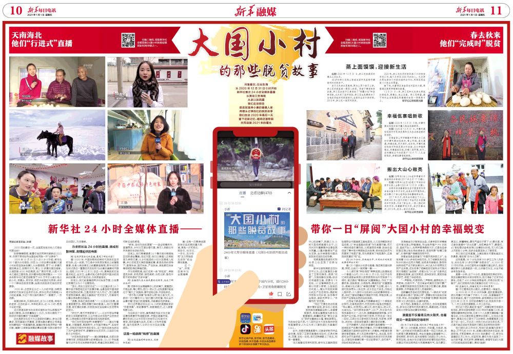 2020年12月31日0點0分0秒起,新華社26個國內分社聯(lián)動,開啟24小時全媒體直播《大國小村的那些脫貧故事》。從白雪皚皚、零下40多攝氏度的黑龍江,到椰風習習、零上10多攝氏度的海南,從海拔超4000米的高原,到廣袤的平原,從數十萬米之遙的衛(wèi)星視角,到纖毫畢現的特寫鏡頭……100余名新華社記者走進散落于960萬平方公里土地上的小村,用鏡頭、用對話、用老鄉(xiāng)的皺紋與笑容,講述一個個鮮活的脫貧故事,繪就決戰(zhàn)脫貧攻堅的恢宏畫卷。