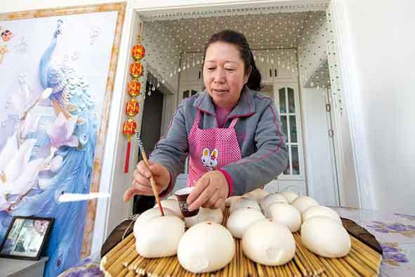 ▲2020年12月31日,李三花在蒸好的饅頭上點紅點。新華社記者楊晨光攝