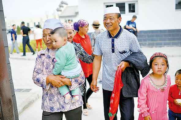 ▲馬幫林(右二)與老伴帶著孫子踏進潤豐村新家(2017年8月17日攝)。