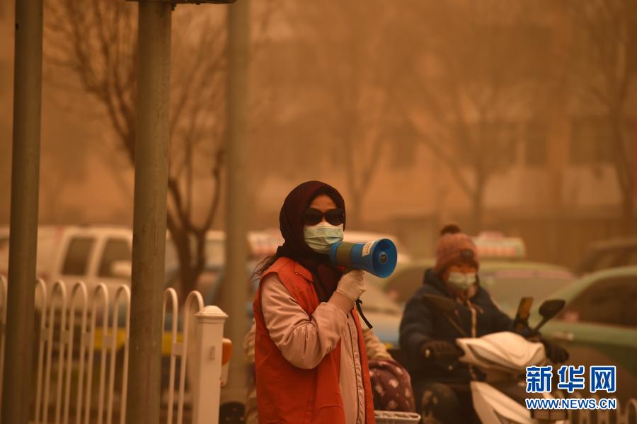 3月15日,在寧夏銀川市,志愿者在沙塵中引導(dǎo)市民出行。當(dāng)日,我國(guó)北方多地出現(xiàn)沙塵天氣。新華社記者 唐如峰 攝