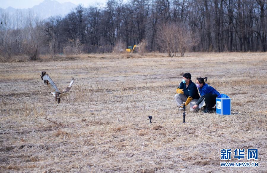 3月20日,北京猛禽救助中心猛禽康復師戴暢(右)和周蕾放飛大鵟。新華社記者 陳鐘昊 攝