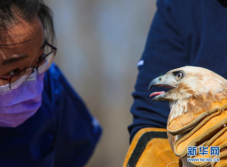 3月20日,北京猛禽救助中心猛禽康復(fù)師戴暢在放飛大鵟前進(jìn)行最后的檢查。新華社記者 李京 攝
