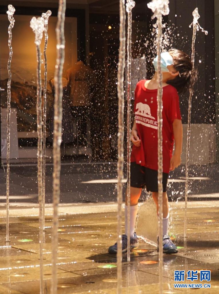 6月16日,美國(guó)加利福尼亞州洛杉磯市民在噴泉中戲水納涼。加州南部本周迎來(lái)今年的首次高溫天氣。