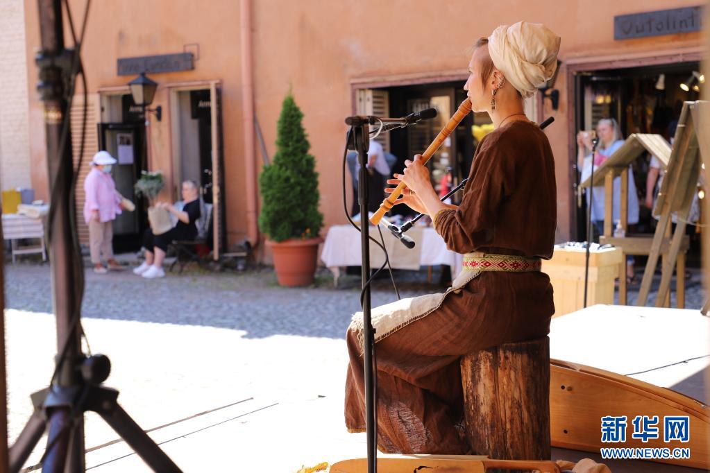 7月1日,一名身著中世紀風格服裝的表演者在芬蘭圖爾庫舉行的“中世紀市集”上演奏。
