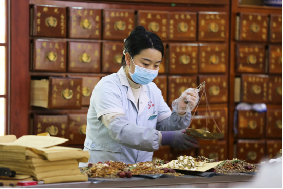 2024年12月24日,在甘肃省定西市中医医院,工作人员在配药准备熬制茶汤。新华网发(王克贤摄)
