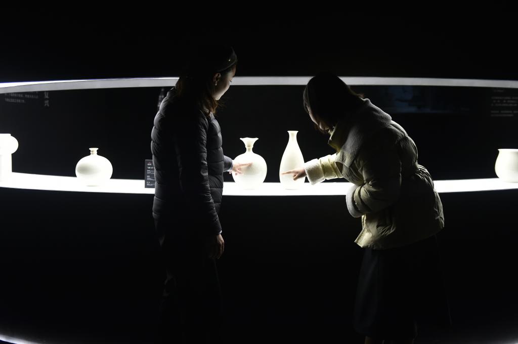12月25日,观众在河北省曲阳县一家定瓷生产企业的展厅参观。