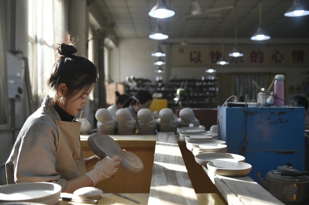12月25日,工作人员在河北省曲阳县一家定瓷生产企业的车间里加工定瓷产品。