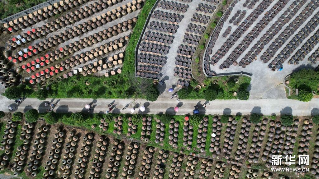 7月10日,游客在畢節市金沙縣禹謨鎮泡木灣醬醋基地參觀(無人機照片)。新華社發(韓賢普攝)