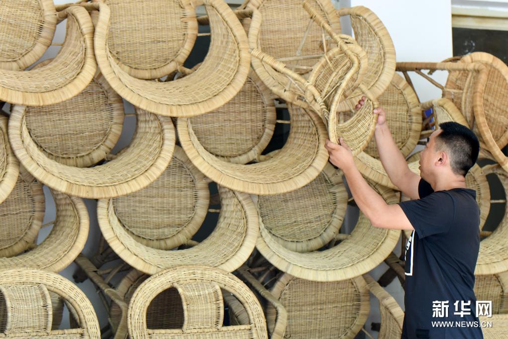 7月10日,在遵義市匯川區板橋鎮婁山關社區,居民在藤編作坊里堆放藤椅成品。新華社發(羅星漢 攝)