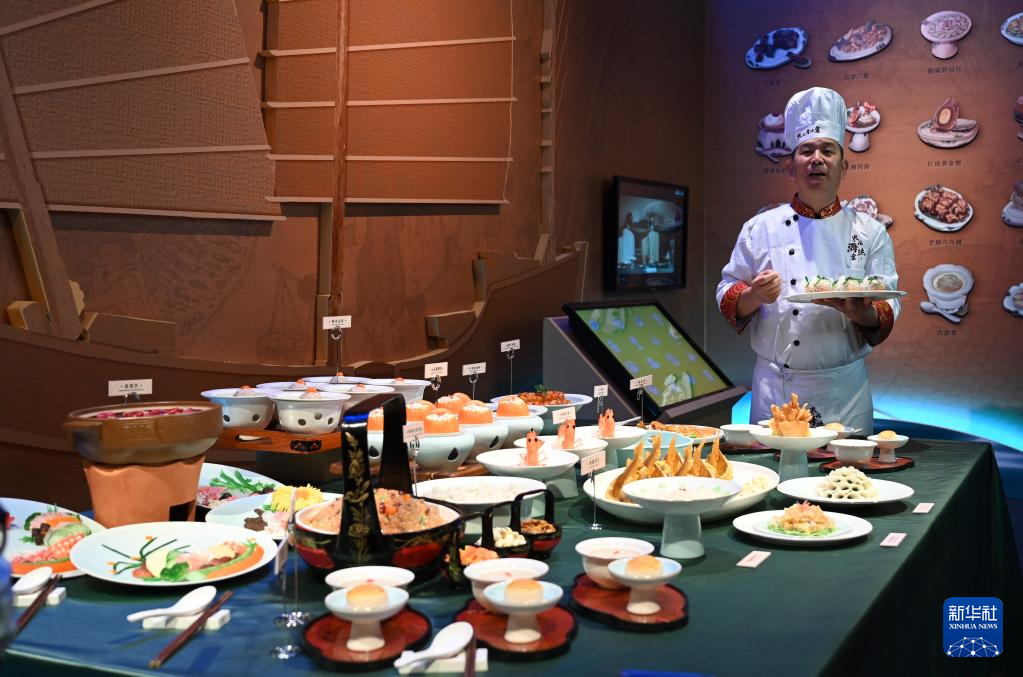 当日,中国国家博物馆“中国古代饮食文化展”完成首期提升改造,“宋元海丝宴”亮相并与观众见面。“宋元海丝宴”以南宋福建泉州石狮籍美食家林洪著作《山家清供》为还原蓝本,兼收闽南名菜,集山珍、海味于一席,将菜品、宴席与宋元器皿、场景、乐曲、诗词等融合,展现宋元时期世界海洋商贸中心独特的美食文化。