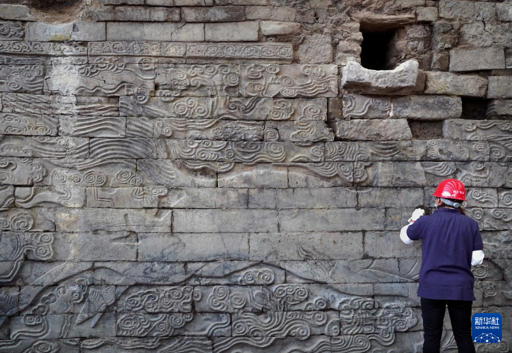 工作人员在清理河南开封州桥遗址出土的巨幅石雕祥瑞壁画(2022年9月21日摄)。