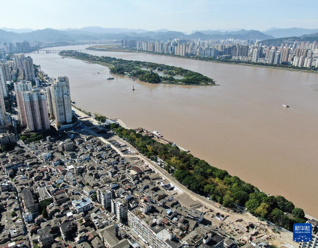 浙江温州朔门古港考古发掘现场,远处为瓯江上的江心屿(2022年10月10日摄,无人机照片)。