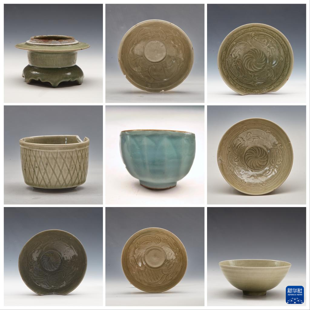 浙江温州朔门古港遗址发掘出的龙泉窑瓷器(拼版资料照片)。