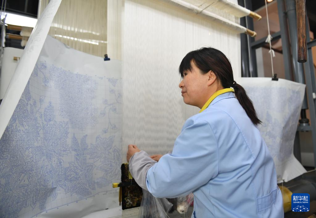 3月21日,四川阆中一家企业工人在根据图纸编织丝毯。
