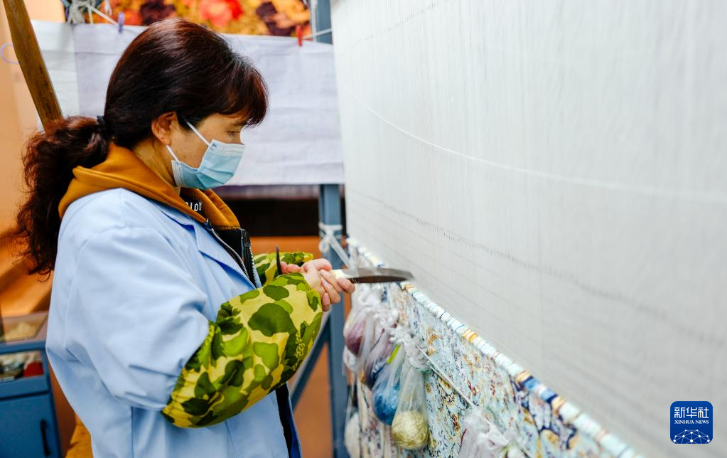 这是3月21日拍摄的正在编织中的阆中丝毯。