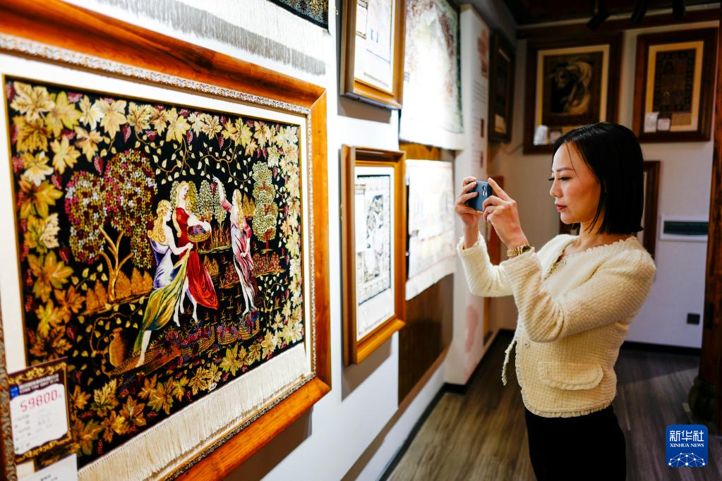 3月21日,游客在银河丝坊观赏出口海外的丝毯产品。