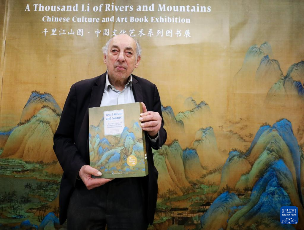 4月18日,在英国伦敦书展上,一名参展者参观《千里江山图》复刻品。