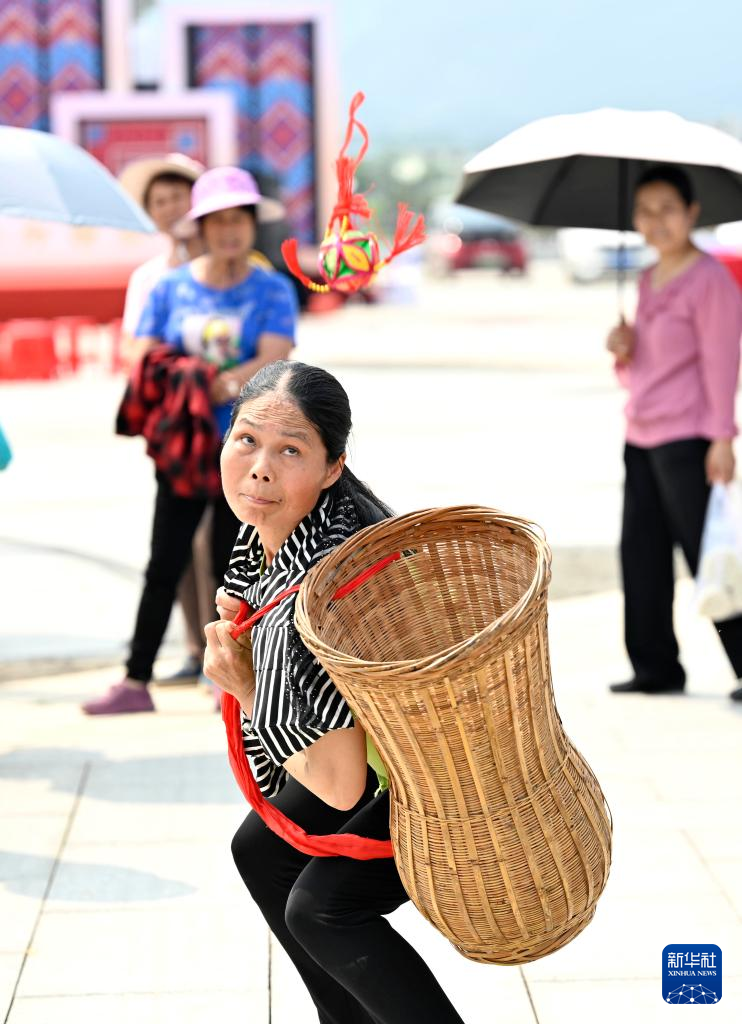 4月20日,在柳城县凤山镇凤鸣广场,村民参加抛绣球活动。