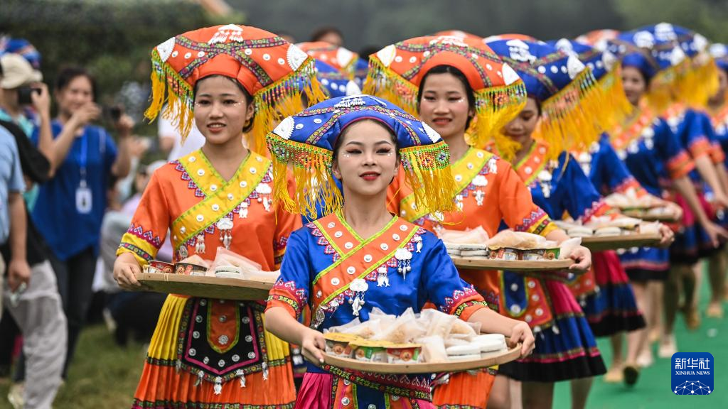 4月22日,一群少女在实景演出现场手拿美食分发观众品尝。