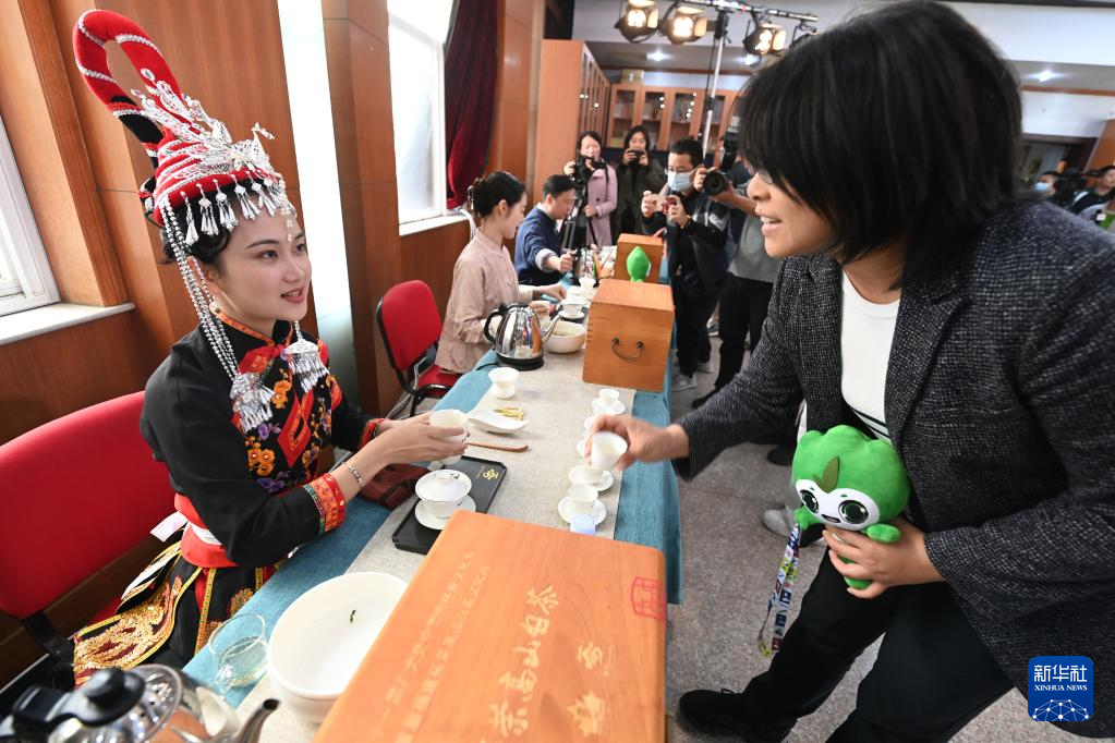 4月25日,来自柘荣县的茶艺师(右)向新闻发布会参加者介绍柘荣白茶。