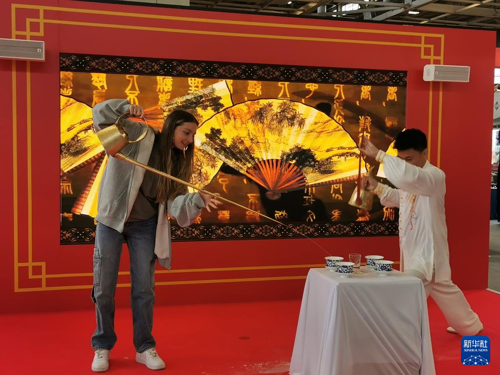 4月27日,一名观众在法国巴黎博览会中国文化主题展区体验“长嘴壶茶艺”。
