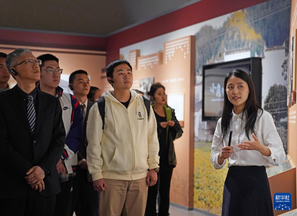 4月28日,在上海市档案馆的展厅内,编研部工作人员戴舒(右一)为参观者讲解。档案馆的青年组成“上海市档案馆青年档案文化志愿宣讲团队”,常年担任馆内展览的志愿讲解员。