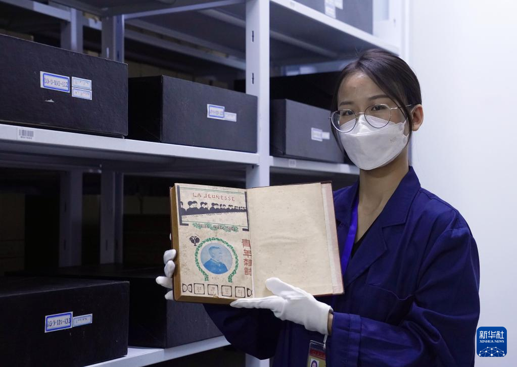 4月28日,在上海市档案馆的珍档库房,保管部工作人员赵竞舸展示馆藏珍档《青年杂志》创刊号。