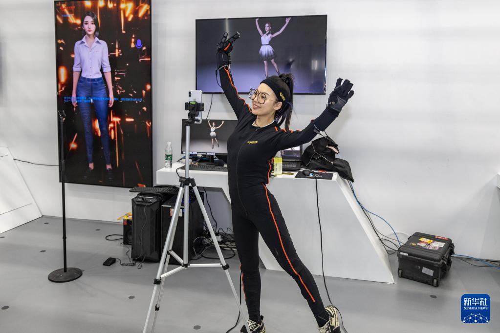 5月5日,在中国影视科技创新成果展上,参展企业展示光学动捕技术。