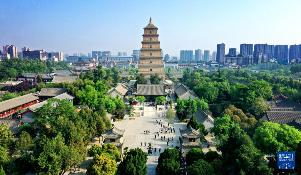 西安大雁塔及慈恩寺(2023年4月19日摄,无人机照片)。新华社记者 刘潇 摄