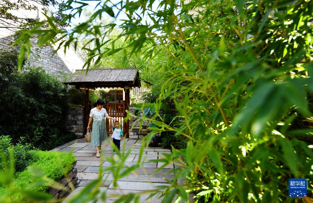 游客行走在西安市长安区秦岭终南山脚下的一个民宿内(2022年7月24日摄)。新华社记者 刘潇 摄