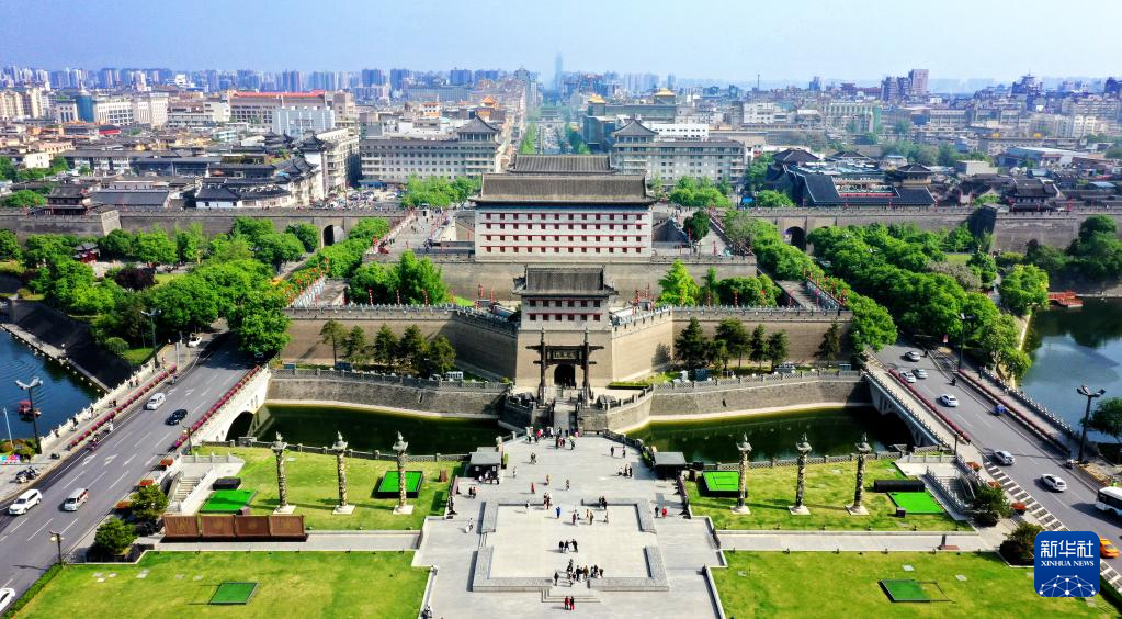 西安城墙永宁门(2023年4月25日摄,无人机照片)。新华社记者 刘潇 摄