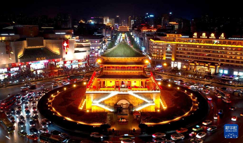 西安钟楼夜景(2023年5月2日摄,无人机照片)。新华社记者 刘潇 摄