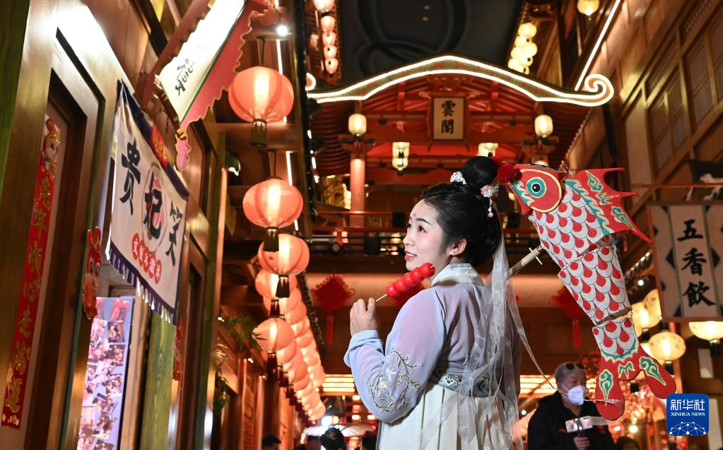 身穿传统服饰的游客在西安“长安十二时辰”主题街区里游玩(2023年1月24日摄)。新华社记者 刘潇 摄