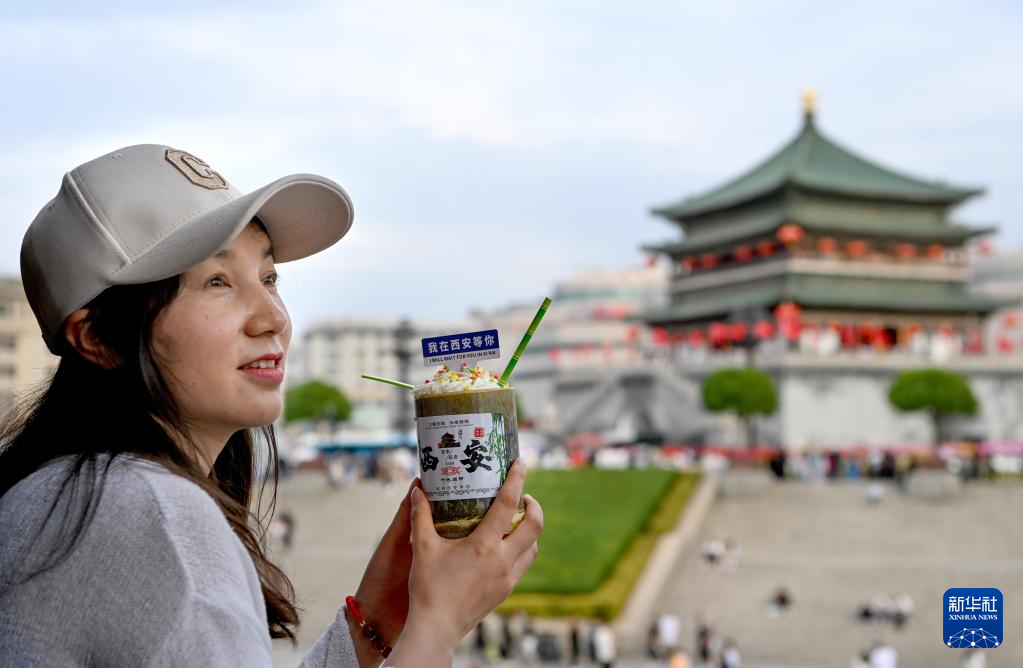 一名游客在西安钟楼附近参观(5月2日摄)。