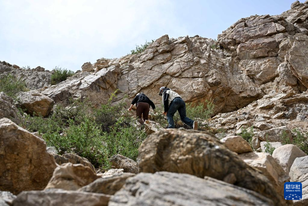 5月13日,驼峰(长城)文物保护队员许继龙(右)和乌仁其其格在巡查阿拉善左旗一处石圈遗址。