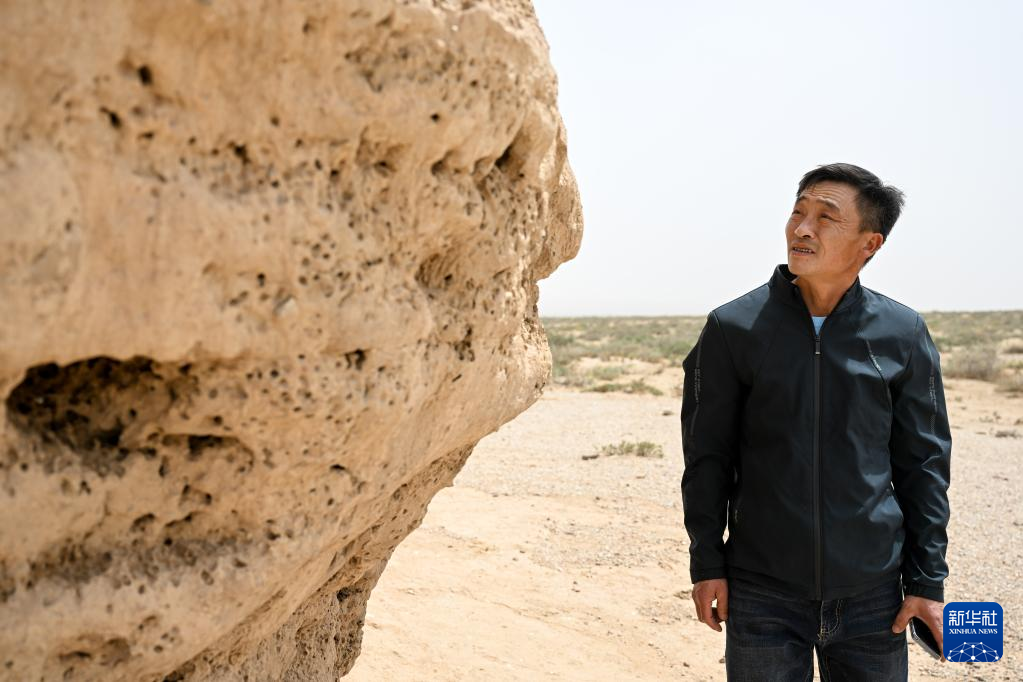 5月13日,驼峰(长城)文物保护队员布音乌力吉在阿拉善左旗一处烽火台遗址巡查并拍照记录。