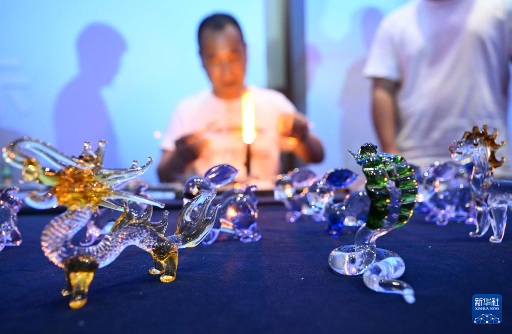 5月16日,民间艺人谭志国展示手工制作玻璃工艺品技艺。