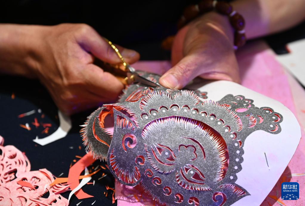 5月16日,民间艺人张林展示满族手工剪纸技艺。