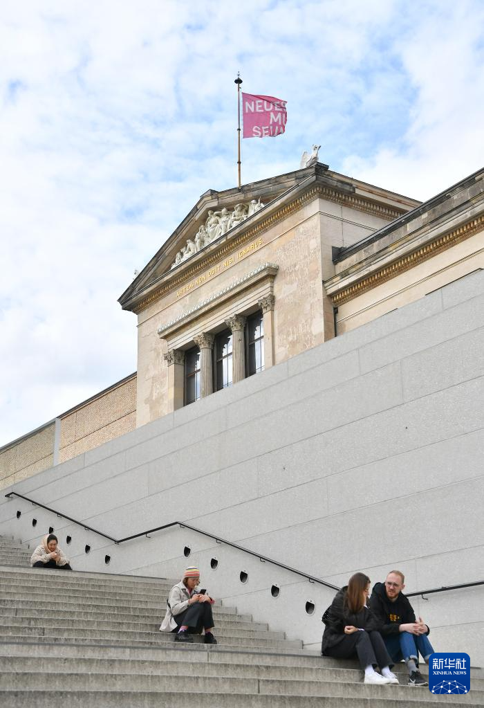 5月16日,在德国柏林博物馆岛,人们坐在新博物馆旁的台阶上休息。