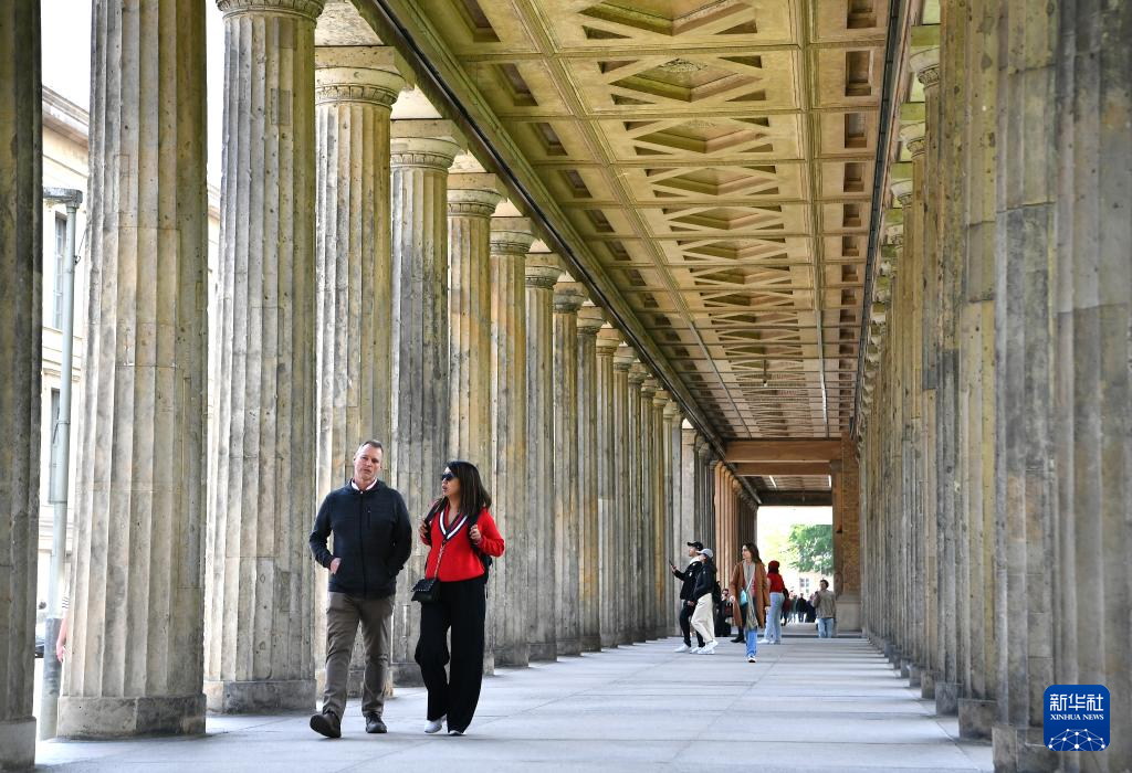 5月16日,在德国柏林博物馆岛,人们经过老国家美术馆前的长廊。