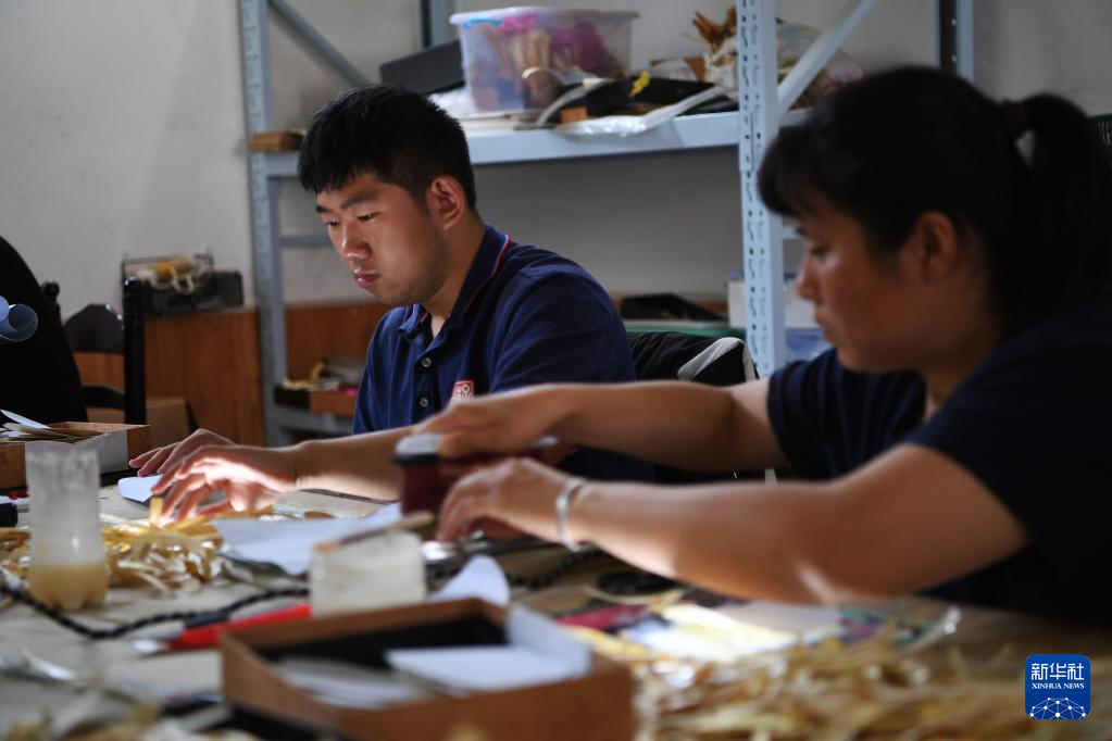 5月17日,张富扬(左)在非遗传习基地制作芦苇画。