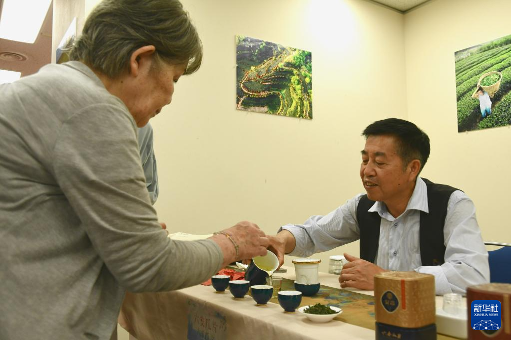 5月22日,在日本东京,参观者(左)在“茶和天下·雅集”活动现场品茶。