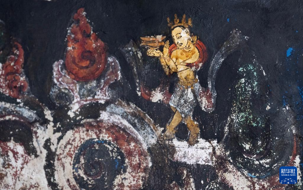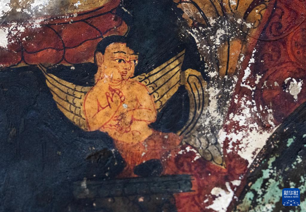 这是5月26日拍摄的皮央石窟壁画中的长翅膀的人物造型。