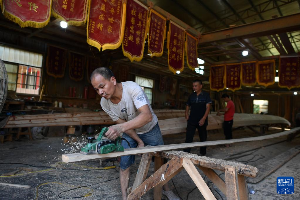 在福州市闽侯县方庄村方和勇龙舟厂,匠人在制造龙舟(6月12日摄)。