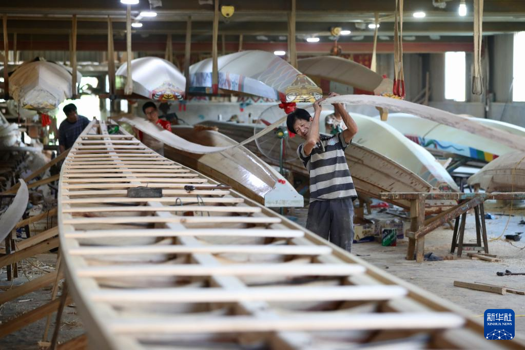 在福州市闽侯县方庄村方和猛龙舟厂,匠人在制造龙舟(6月12日摄)。
