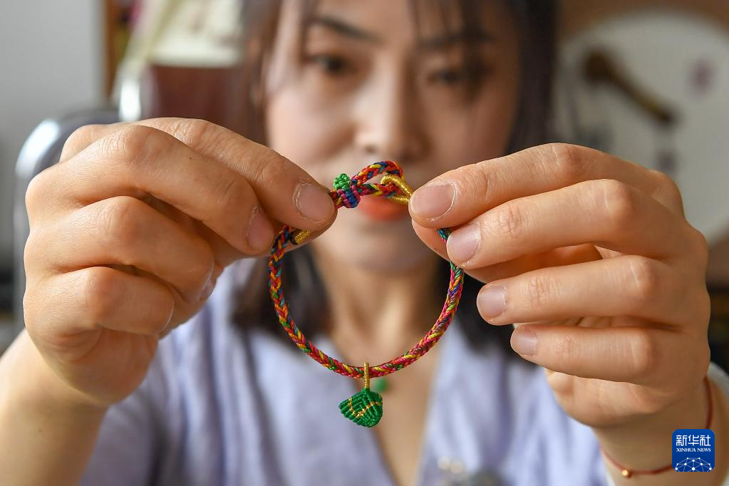6月20日,在吉林省长春市,徐晓雪整理端午绳结工艺品。