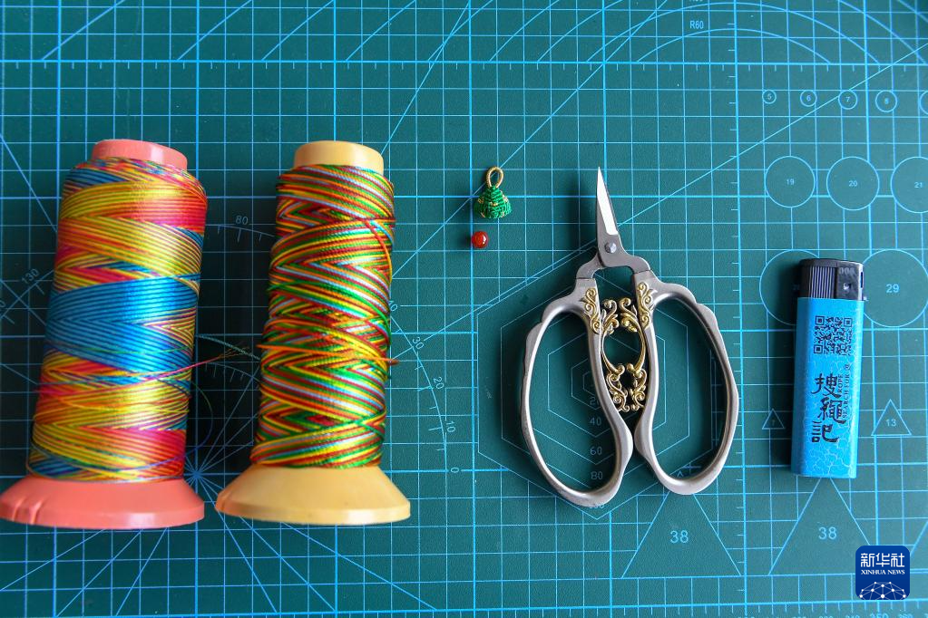 在位于吉林省长春市的徐晓雪工作室内拍摄的制作绳结工艺品的材料和工具(6月20日摄)。