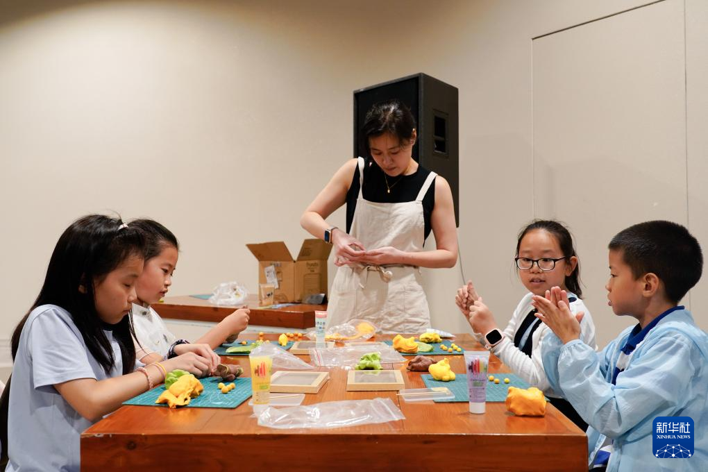 7月16日晚,小朋友在世博会博物馆制作向日葵粘土相框。