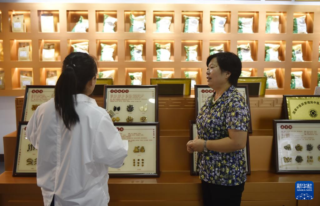 8月4日,在禹州中医药文化技艺传习馆,非遗项目“禹州中药加工炮制技艺”代表性传承人朱改莲(右)向参观者介绍中药材知识。