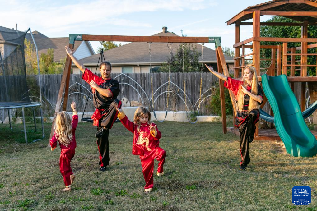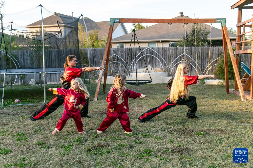 如今,夫妻俩在家中时常利用网络视频练习武术,他们的两个孩子也耳濡目染成为小武术迷。每个周末,全家会驱车一个多小时到达拉斯市郊一家功夫学校习武。
